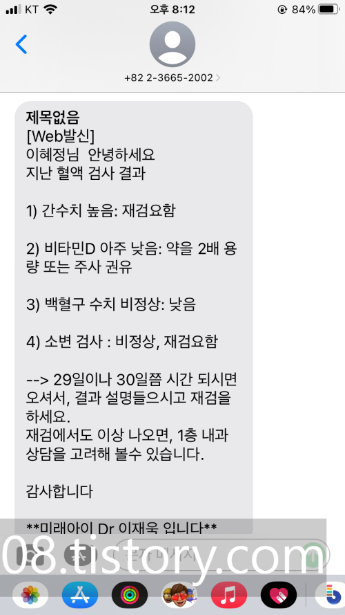 - 간수치 높음/ 비타민D 아주 낮음 / 백혈구 수치 비정상 / 소변검사 비정상